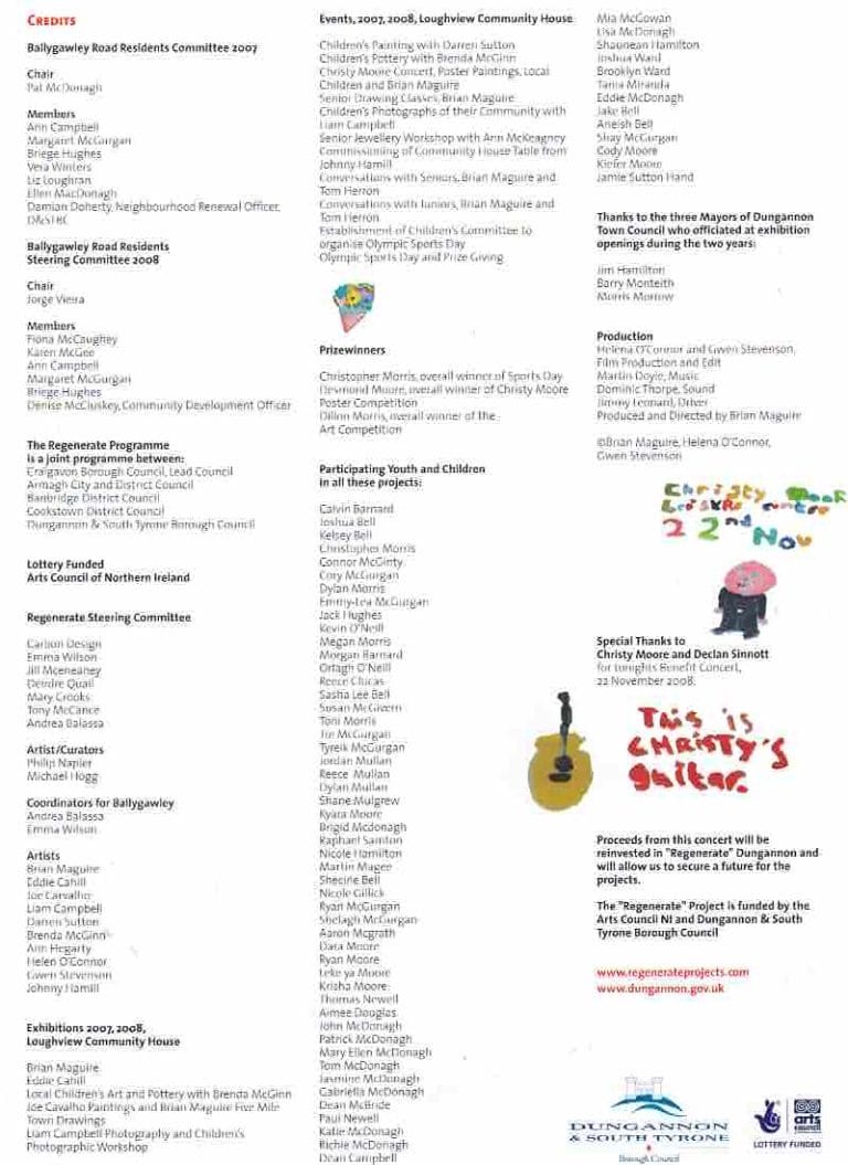Following a two-year residency by Brian Maguire, which culminated in a benefit concert by Christy Moore in November 2008, Gwen Stevenson continued the residency in the Ballygawley Road Estate in 2009. Proceeds from the concert, alongside funding from participating district councils and the Arts Council of Northern Ireland, supported the continuation of the project.